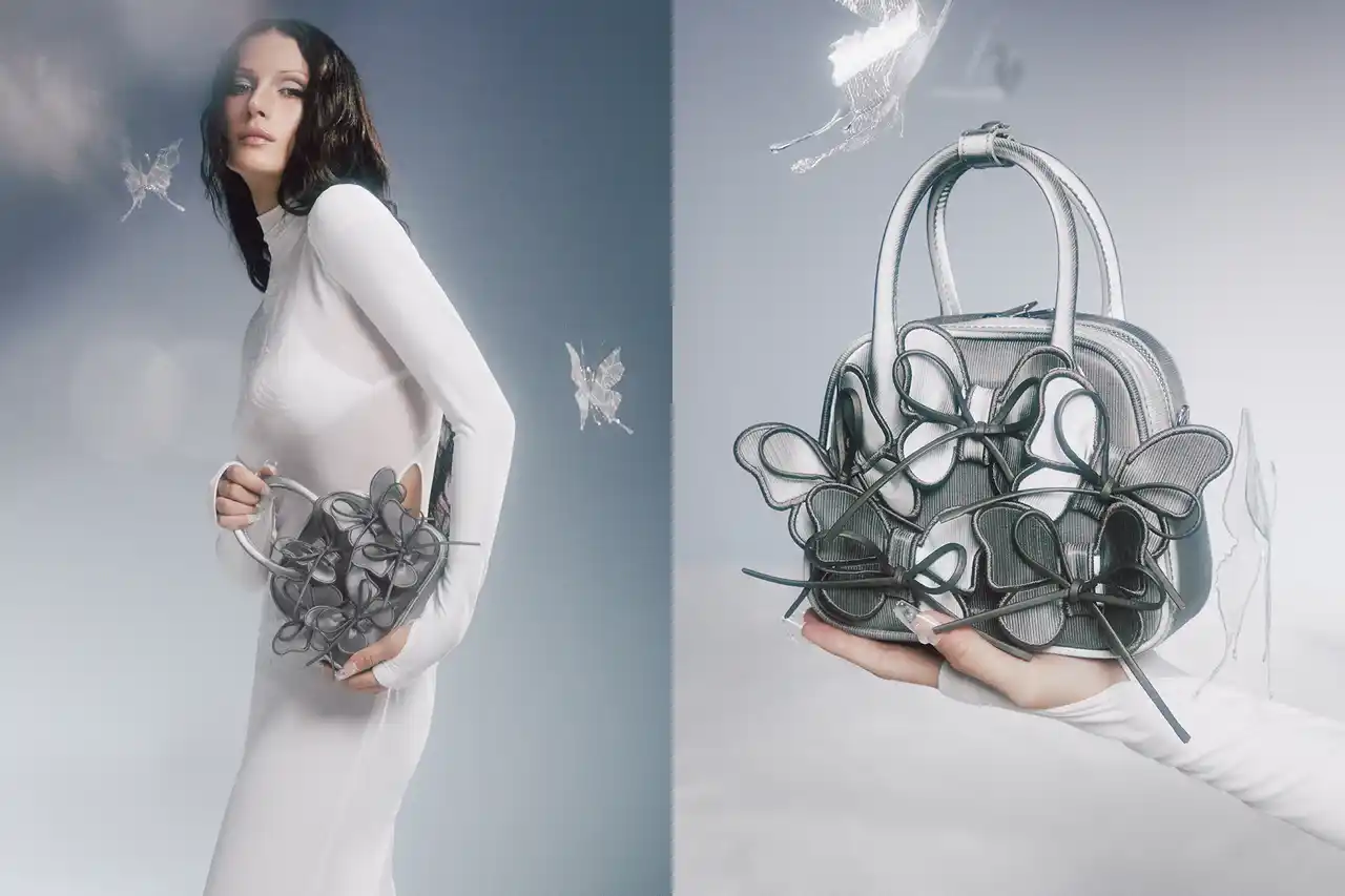 「フリーティングモモバッグミニ」は蝶々のモチーフ飾りが印象的な本コレクションのメインバッグとなります。トートとしてはフェミニンな雰囲気を、付属ストラップを使用すればクロスボディとしても楽しめる 2WAY仕様のアイテムです。 |