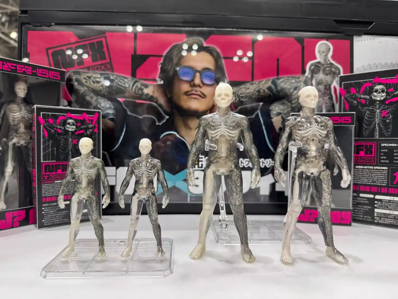 | 今回のコラボレーションは、“実在するアーティストの身体表現” と “3D造形アート” の融合によって、NOEZ FOXX独自のカルチャー性をリアルプロダクトとして体験してもらうことを目的に企画されました。DJ? Foy本人の“刺青”デザインをもとに制作した透明人体模型は、アート作品としてもインテリアとしても高い注目を集め、会場でも多くの来場者が足を止める人気アイテムとなりました。 | |||