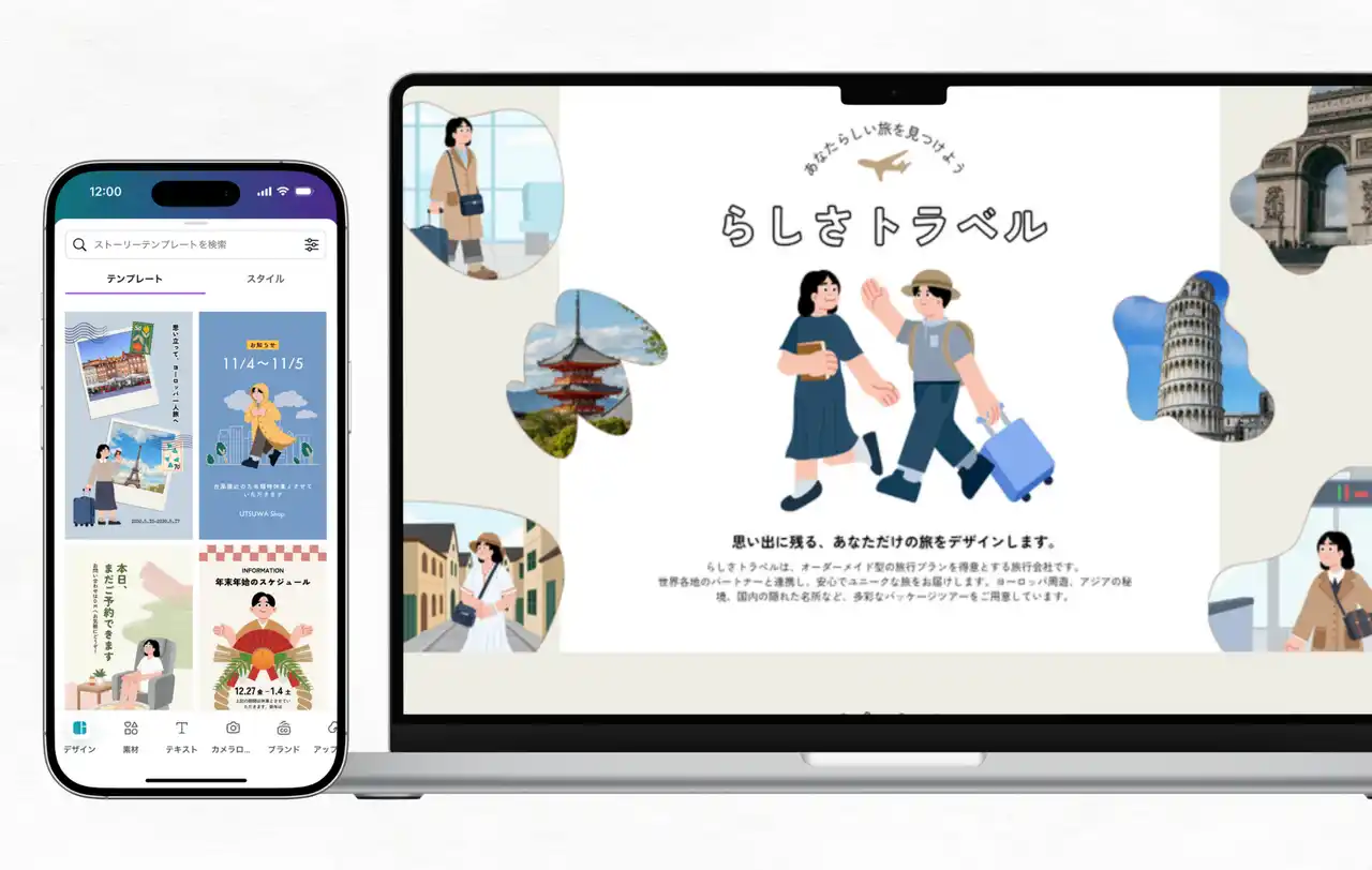 デザインの第一歩を踏み出す初心者から、パワフルなツールを求めるプロのクリエイターまで、Canvaはユーザーが思いついたアイディアを美しい作品に仕上げるために必要なものを提供します。デザイナーが手がけた世界最大規模のコンテンツライブラリを基盤に、Canvaは多彩なプロダクトと独自のAIツールを搭載。個人やチームが、より直感的にクリエイティブを生み出し、協力しながらスムーズにコミュニケーションできる環境を提供します。 |