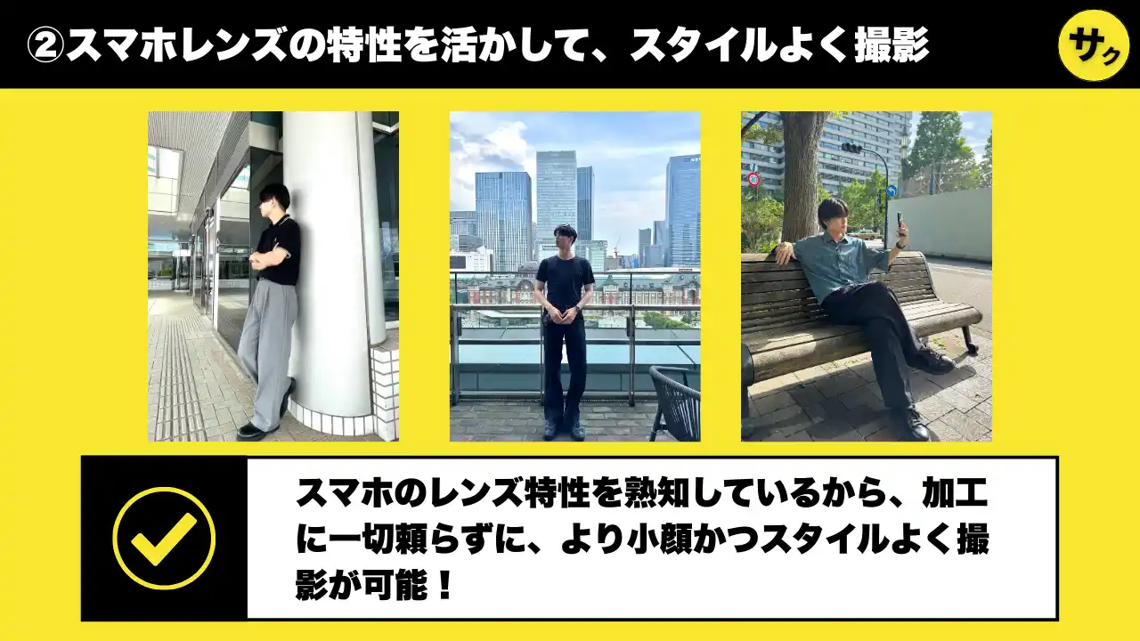 足が長く見える構図や顔まわりがスッキリ見える角度など、スマホのレンズ特性を熟知したプロが、加工に頼らず撮影技術だけであなたのスタイルを最大限に引き出します。 |