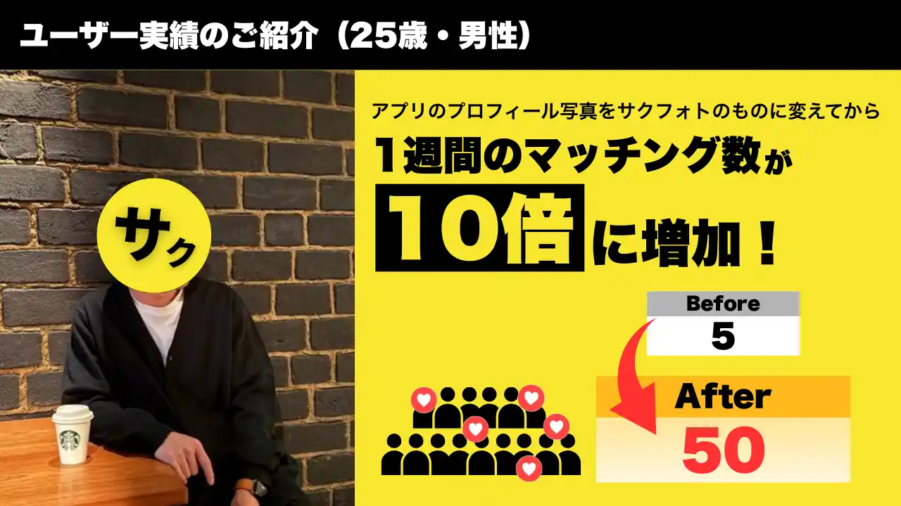 先行利用者へのインタビューでは、それまで1週間で5件だったマッチング数が、本サービスの写真に変更後は1週間で50件と約10倍にまで急増した事例も確認されています。 |