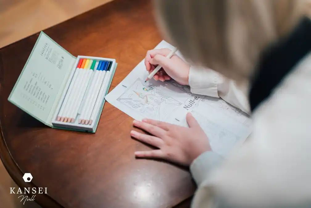 視覚テーマをさらに深める体験として、 全客室にオリジナル心理アートワークとなる塗り絵を設置しています。塗り絵シートと色鉛筆を用い、直感で選んだ色や塗り方から その時の心の状態を“視覚的に”理解できるKANSEI独自のコンテンツです。スマートフォンから少し離れ、色と向き合うことで、 「今なぜこの色に惹かれたのか」に気づく小さな内省の時間が生まれます。 |