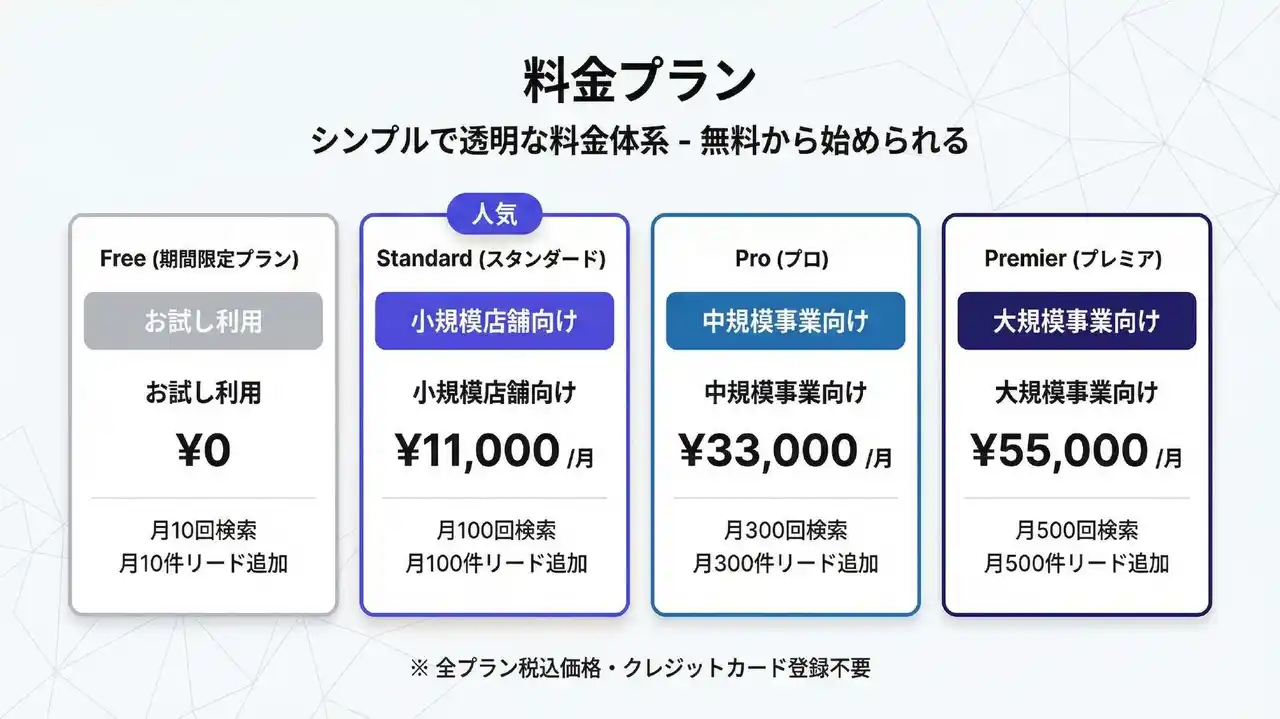 無料 (月10回の検索、月10件のリード追加)