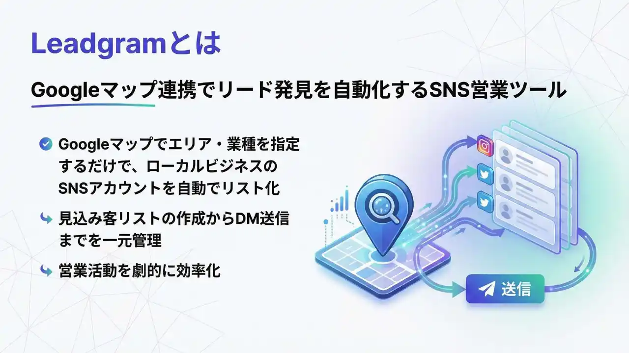 Leadgramは、Googleマップでエリアと業種を指定するだけで、対象となるローカルビジネスのSNSアカウント(Instagram, X, Facebookなど)を自動で抽出し、見込み客リストをワンクリックで作成できるクラウドサービスです。リスト作成から顧客管理、パーソナライズされたDMの送信支援までをワンストップで提供し、営業プロセスのDXを力強く推進します。