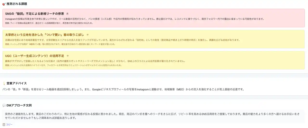 現在Ver.1.0のため、今後は、AIを活用した最適なDM文面の自動生成機能や、さらなる対応SNSの拡充、CRM/SFAツールとの連携強化などを予定しております。お客様の声を反映しながら、より一層のサービス価値向上に努めてまいります。 |