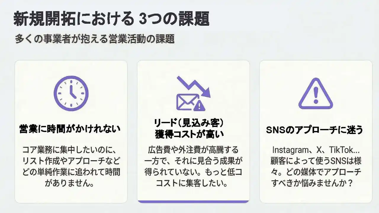 多くの企業、特に地域に根差したサービスを展開する事業者にとって、新規顧客の開拓は重要な経営課題です。しかし、従来の営業手法では、「Googleマップで一軒ずつ店舗情報を検索しリスト化するのに膨大な時間がかかる」「画一的なDMでは返信率が低い」「システムでの大量送信はスパムと判定されるリスクがある」といった多くの課題を抱えていました。株式会社スゴヨクは、これらの課題を解決し、より多くの事業者がコア業務に集中できる環境を創出するため、Leadgramを開発いたしました。