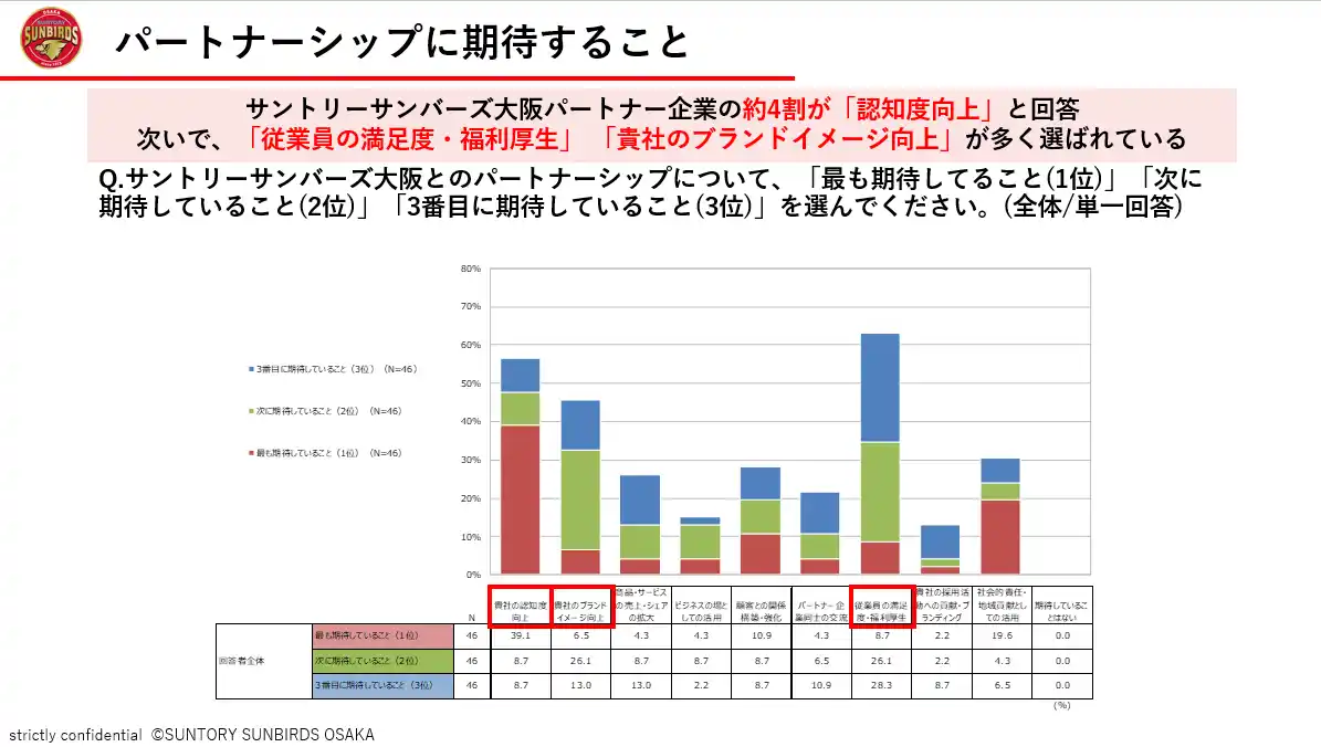 サントリーサンバーズ大阪(サントリーホールディングス(株)スポーツ事業部)は、パートナーシップの取り組みを通じて得られた成果や価値を明らかにするため、サントリーサンバーズ大阪パートナー企業の皆様に対して、満足度調査を実施いたしました。 |