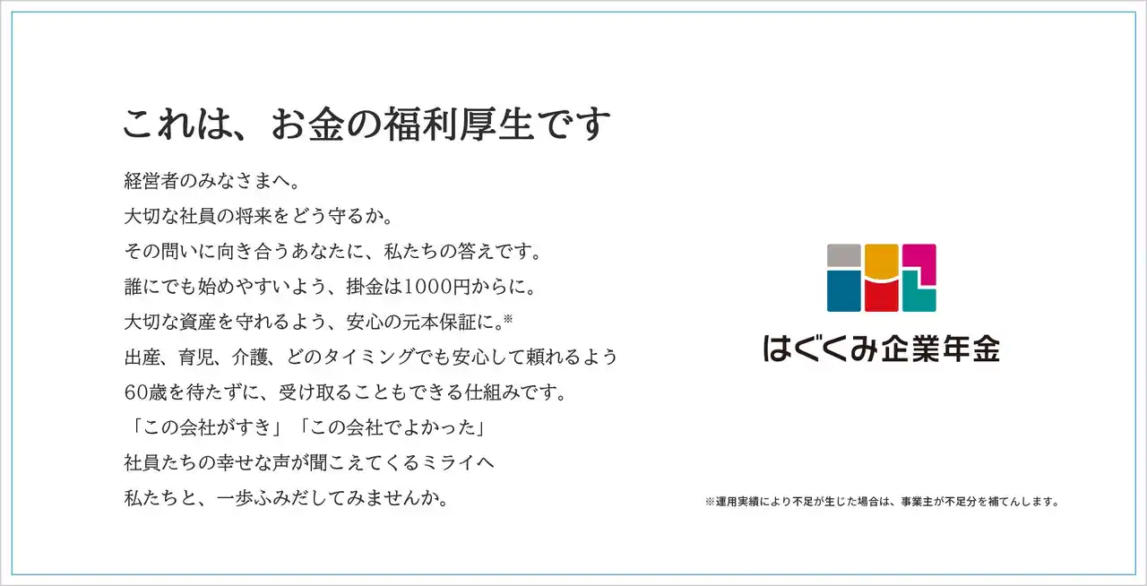 | 「はぐくみ企業年金」は厚生年金被保険者であれば、従業員(非正規雇用含む)でも役員でも加入可能な確定給付企業年金(DB)で、事業主側はコストを抑えながら企業年金・退職金制度を構築することができます。企業年金・退職金制度の充実が従業員満足度向上・離職率低下につながったというお声もいただいており、特に人手不足が深刻化している中小企業や福祉業界において、従業員に安心して働いてもらうための「お金の福利厚生」としてご好評いただいています。 | ||||||||||||||