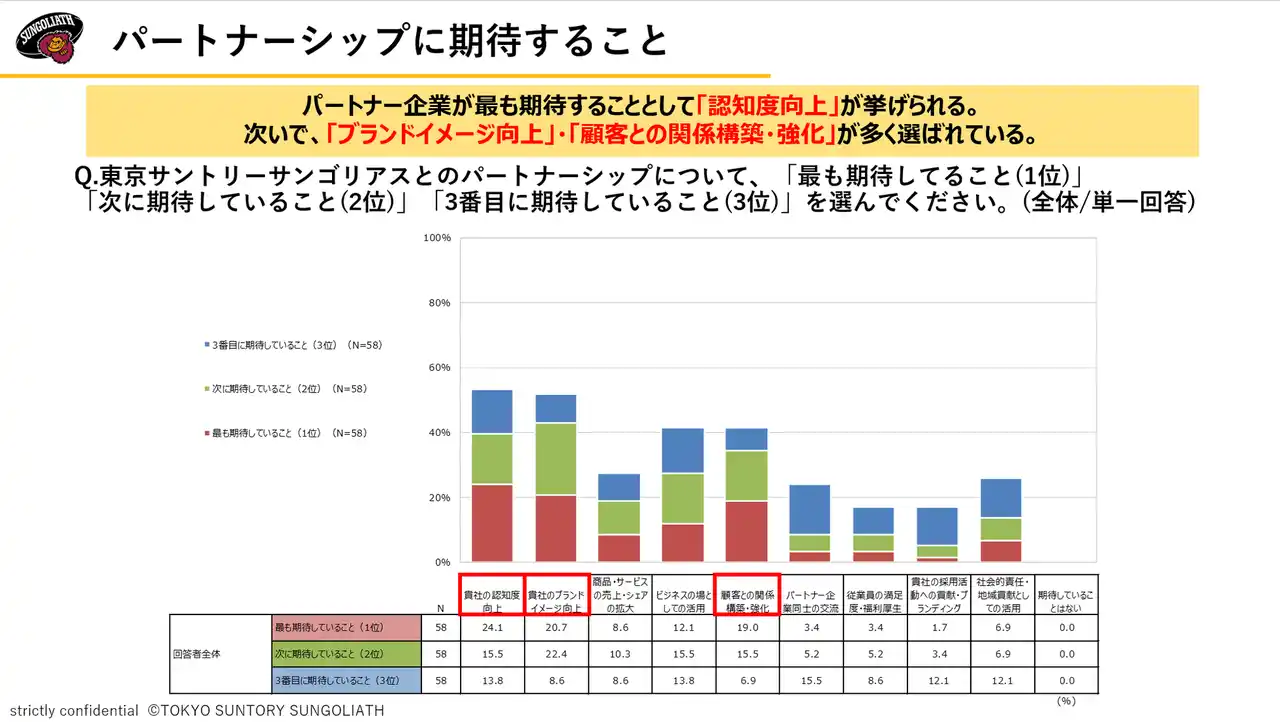 東京サントリーサンゴリアス(サントリーホールディングス(株)スポーツ事業部)は、パートナーシップの取り組みを通じて得られた成果や価値を明らかにするため、東京サントリーサンゴリアスパートナー企業の皆様に対して、満足度調査を実施いたしました。 |