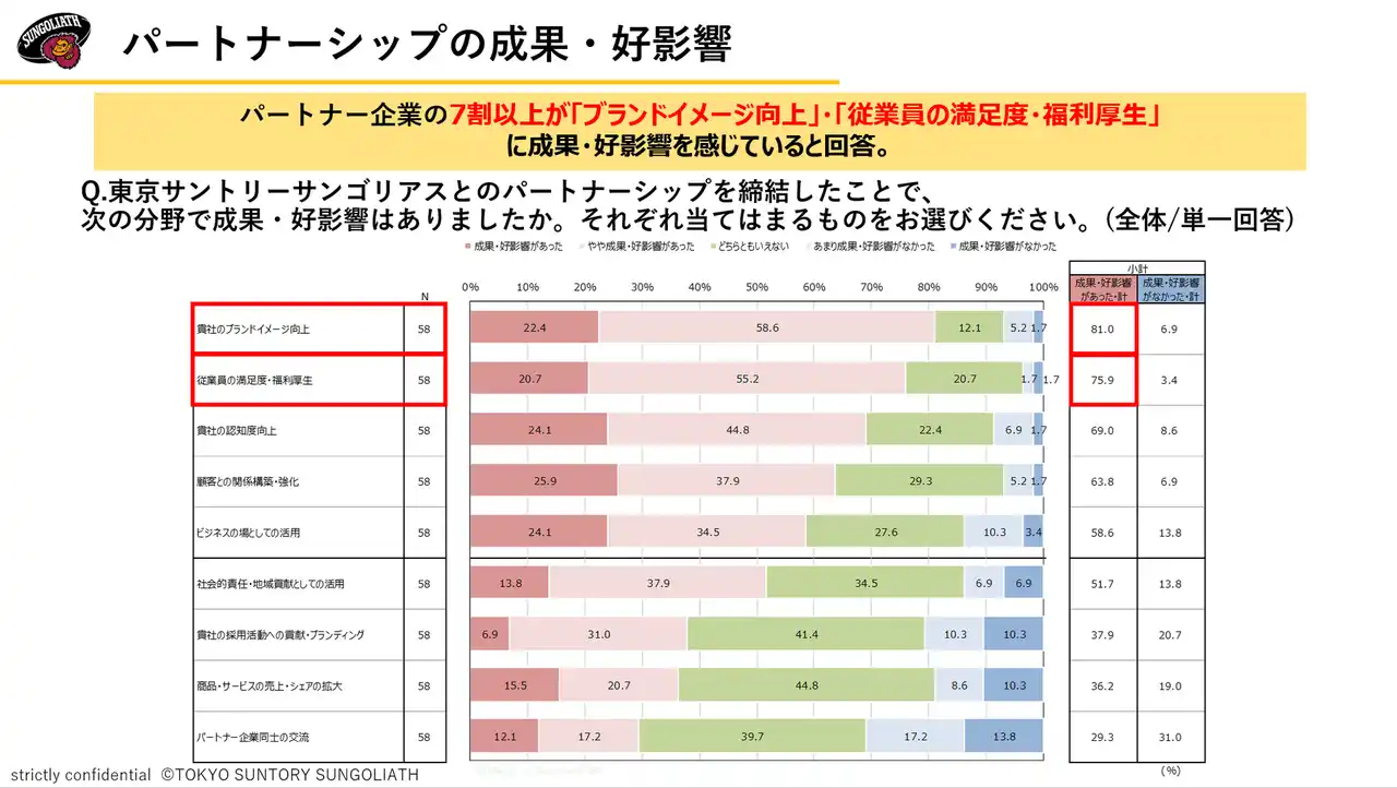 東京サントリーサンゴリアスのパートナー企業さまより、サンゴリアスとのパートナーシップを通じて、「認知度・ブランドイメージ向上」「売上・シェアの拡大」「顧客との関係構築・強化」「従業員の満足度・福利厚生」「採用活動」「地域貢献」に成果・好影響があったとのお声をいただきました。 |
