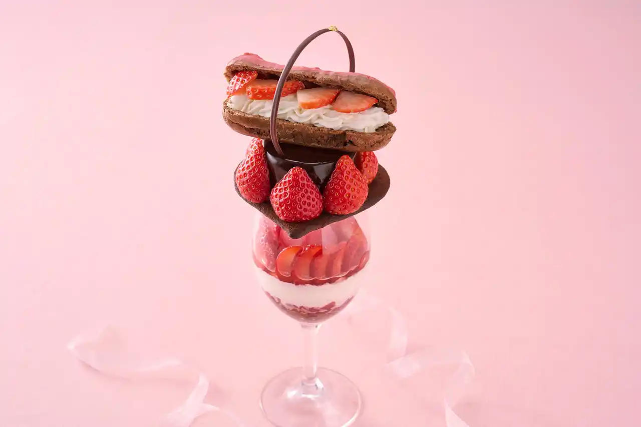 「本命パフェ~苺ショコラの贈り物~」は、苺とスイーツを美しく重ねた、華やかで贅沢なグラスパフェです。トップの苺エクレアの下には、苺ジャムとココアスポンジを重ねたケーキが隠れていて、その下のハート形のココアサブレを開くと、甘くてやさしい苺の世界がグラスの中に広がります。 |
