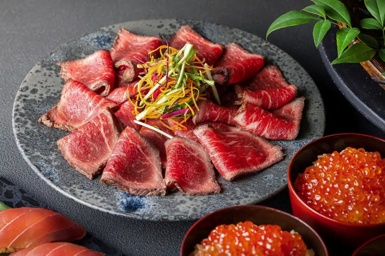 素材の魅力を最大限に引き出す“タタキ”に仕立て、口いっぱいに豊かな風味をご堪能いただけます。また、今回初登場となる道央・厚真町の“幻のブランド豚” 「米愛豚(まいらぶた)」は、北海道産米「ななつぼし」を食べて育ち、脂身は上品な甘さを帯び、赤身は柔らかく澄んだ味わいが特長です。その魅力を閉じ込めるクルート焼きに仕上げ、外側は香ばしく、中はしっとりとジューシーにご提供いたします。青森県、大間のまぐろと同じ漁場で水揚げされる希少価値の高いブランドまぐろ「戸井