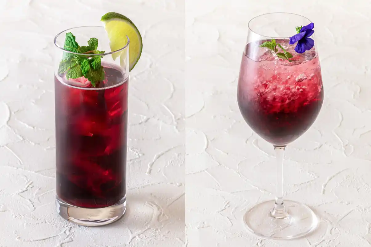 ハスカップを使用したカクテル紫雫(左)モクテル(紫霧) |