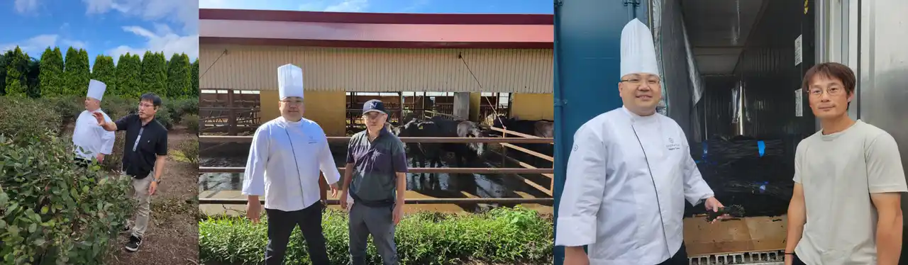 「冬の北海道フェア~十勝・道央~」の開催に先立ち、コンパスのシェフが北海道を訪れ、地域が誇る多彩な食材を現地で視察しました。北海道厚真町ハスカップファーム「山口農園」では、収穫したてのスーパーフード“ハスカップ”に触れ、その瑞々しい香りと深い酸味を活かすメニューのイメージを膨らませました。また、「北の牧舎」では、恵まれた環境で健康に育った牛から生まれるブランド牛“e-びーふ”のこだわりを確認。