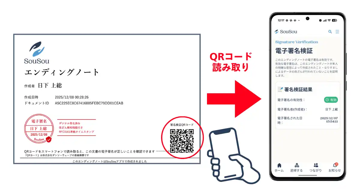エンディングプラットフォーム「SouSou」を運営する株式会社そうそう(本社:埼玉県川口市、代表取締役:日下上総、以下「当社」)は、2025年12月19日、エンディングノートに入力した内容を A4縦サイズのPDFとして出力できる新機能 を、本人確認済みユーザー様向けに提供開始しました。PDF出力機能では、出力時に利用者本人の電子署名を必須とすることで、「本人が、いつ作成した文書か」を後から検証できる仕組みを備えています。クラウド上で安全に保管されるデジタルエンディングノートに加えて、「手元に残せる安心感」とアプリを利用していないご家族とも共有できる利便性を兼ね備えた機能です。 |