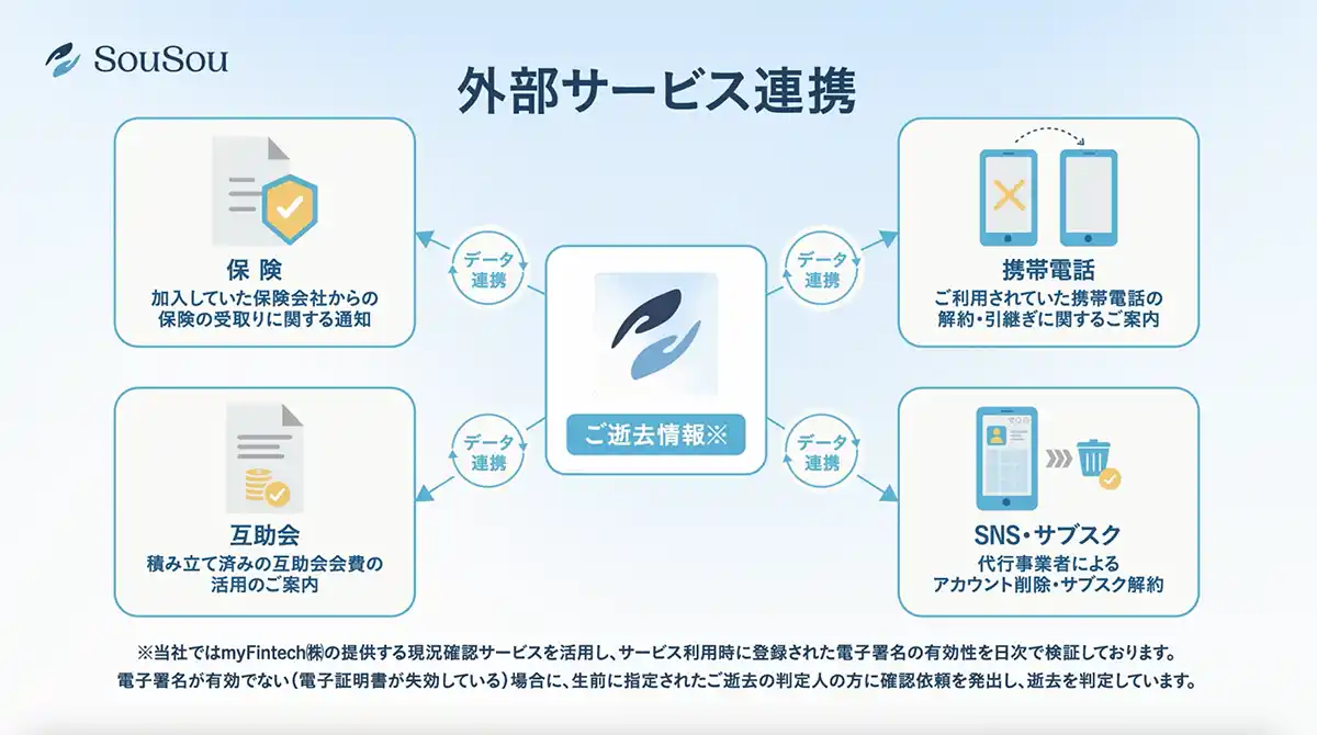 「SouSou」はマイナンバーカードを活用した新しいデジタル終活サービスです。エンディングノート等の終活に必要な様々な機能を、アプリ利用料金完全無料・ワンストップで提供します。また従来のサービスにはない「1..本人性/真正性の担保」・「2..逝去判定のデジタル化」・「3..外部サービス(データ)連携」という3つの特徴を備えており、今後は様々なパートナー企業との連携を通じて、ご逝去後の各種手続きの自動化・簡略化を目指します。 |