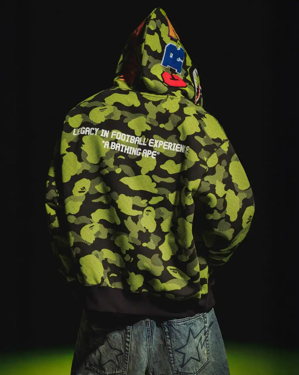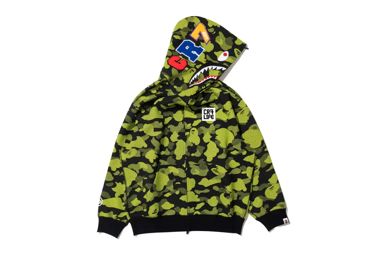 今回のコレクションの中心となるのは、REFLECTION CAMOを採用した「シャーク フルジップ フーディ」。BAPE(R)を象徴するカモフラージュパターンを大胆に再解釈し、躍動感やエネルギーを象徴するモチーフを、CR7(R) LIFEのブランドアイデンティティにインスパイアされた鮮やかなグリーンで表現しました。ストリートとフットボールカルチャーのシームレスな融合を体現する、ファンやコレクター必見の一着です。 |
