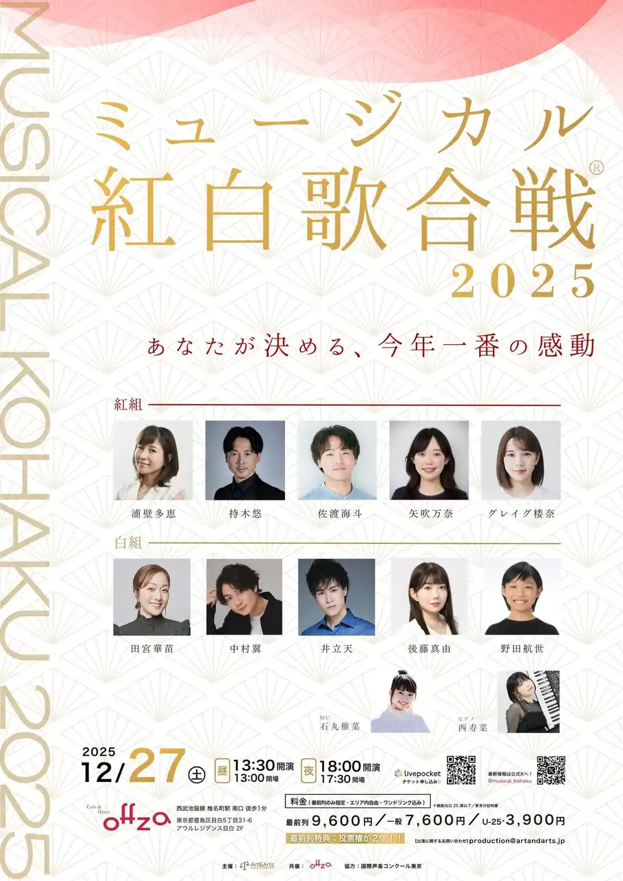 エンターテインメントの企画・制作を行うArt&Arts(東京都板橋区、代表:山崎聡一郎)は、2025年12月27日(土)、東京・椎名町のCafe & Diner Offza(カフェ&ダイナー オフザ)にて、年末恒例のイベント『ミュージカル紅白歌合戦2025』を開催いたします。 |