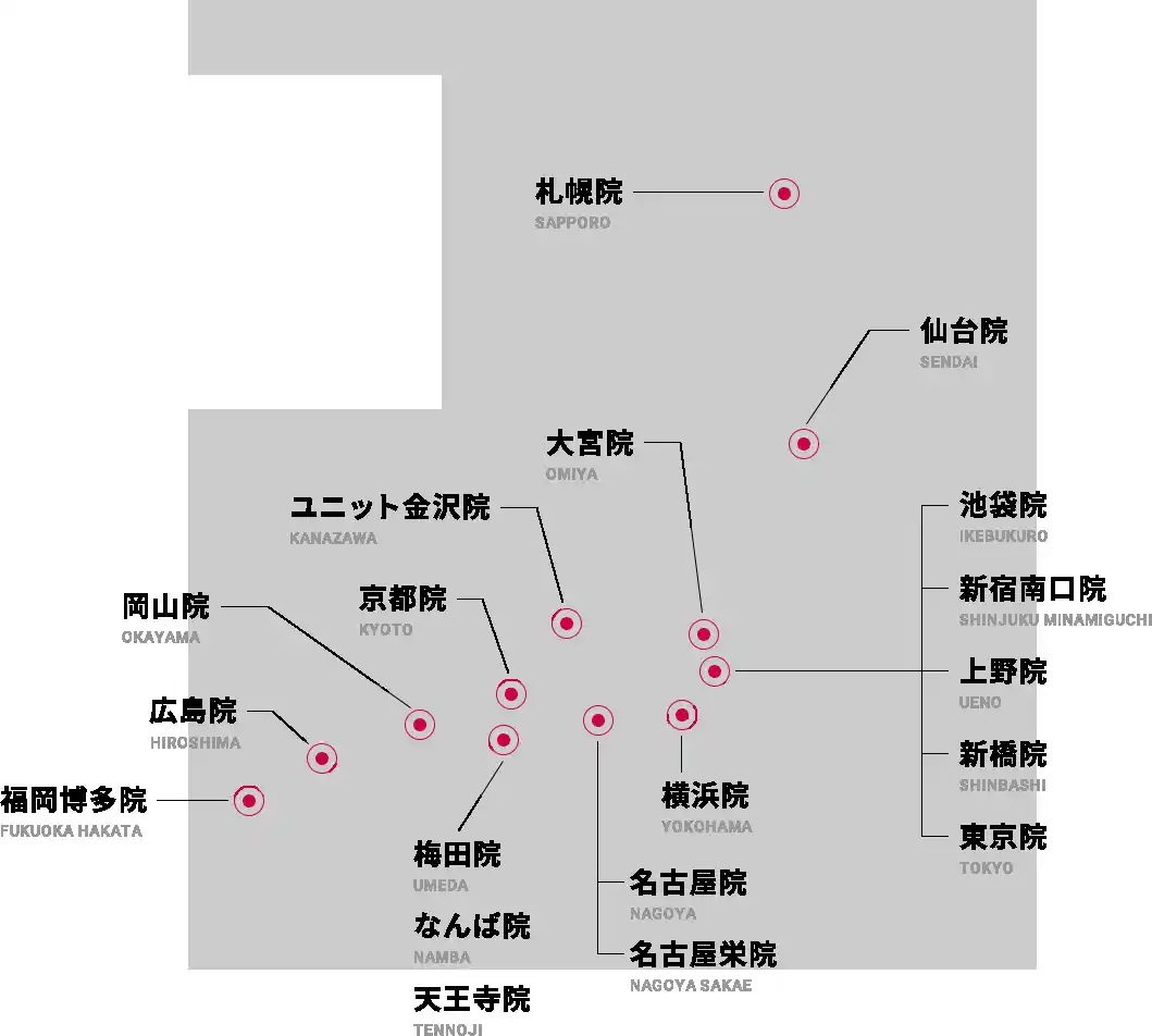 | 当グループは提携院を含め、北海道(札幌)、東北(宮城・仙台)、関東(東京、埼玉、神奈川)、北陸(金沢)、中部(名古屋、栄)、関西(大阪、京都)、中国(広島、岡山)、九州(福岡・博多)と全国に19院展開しております。 | |||
