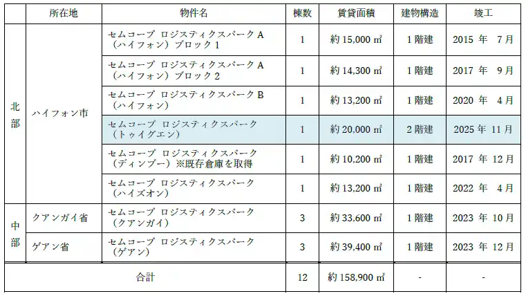 ※2 現在建設中で、2026年冬頃に竣工予定のセムコープ ロジスティクスパーク(ディンブー)の5棟が竣工すると、合計17棟・総賃貸面積約24万平方メートル となります。 |