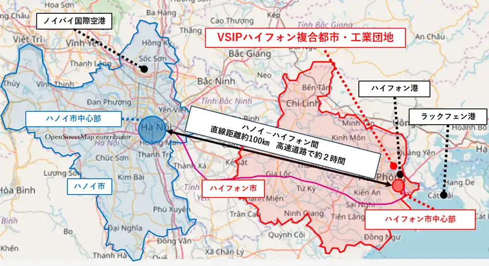 (C)OpenStreetMap contributors(opendatacommons.crg)(一部加工)/道路名(桃色線):ハノイ―ハイフォン間 高速道路 |
