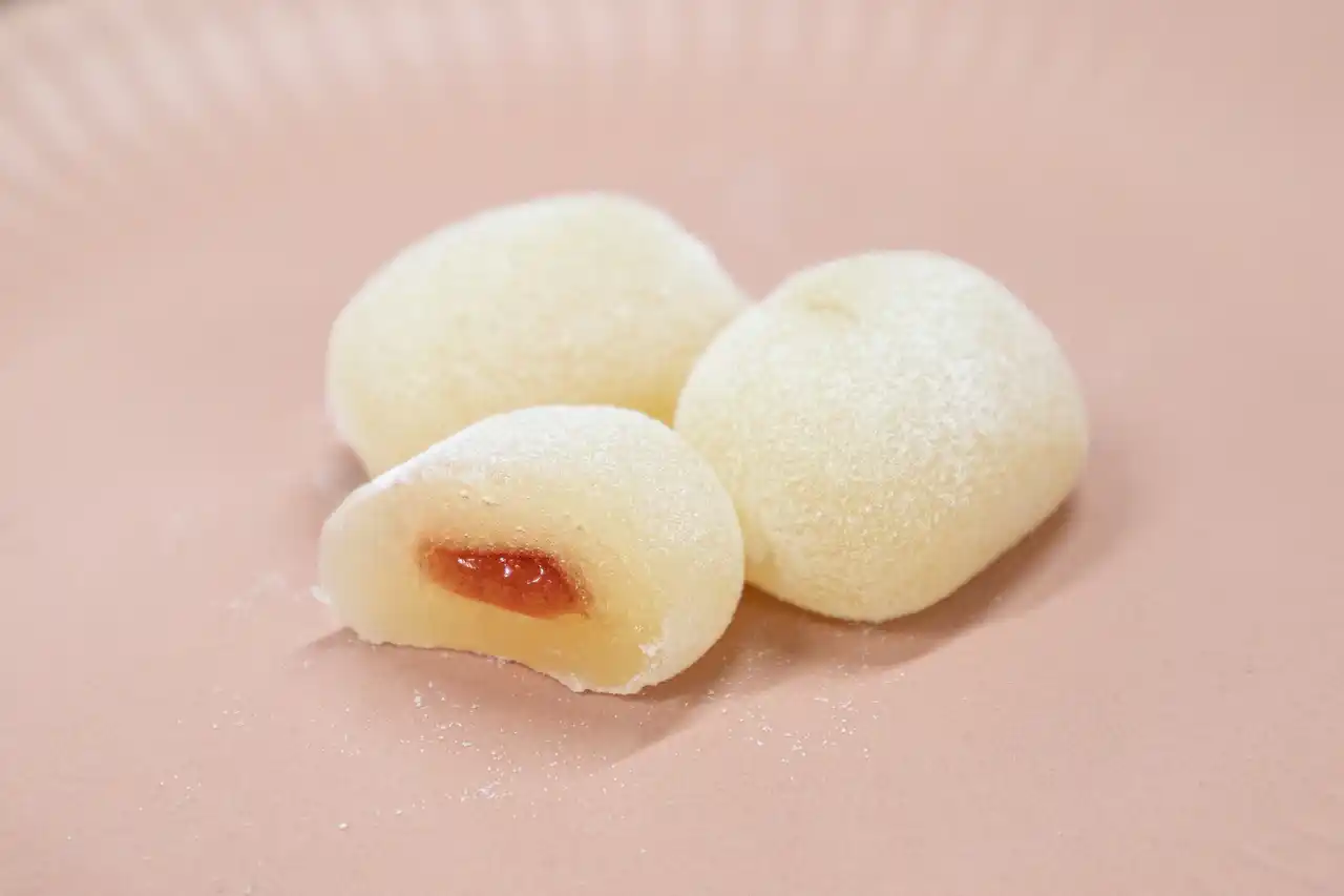 特製の果物ジャムを、柔らかな求肥で包んだ一口サイズのお餅です。羽二重餅の製法で蒸した餅粉に、水あめや砂糖を加えて練り上げた求肥で、果物のジャムをやさしく包み込んだ、なめらかで上品な味わいが特徴です。 |