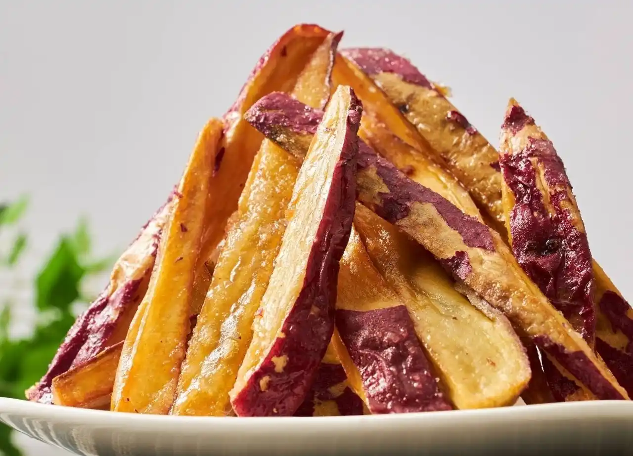 紫芋のパウダーを練り込んだ生地にホイップ、安納芋ソース、さつまいもの |