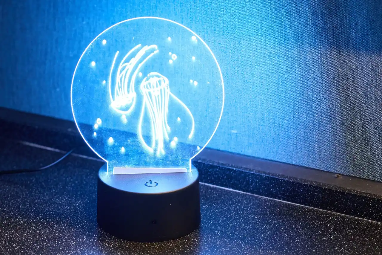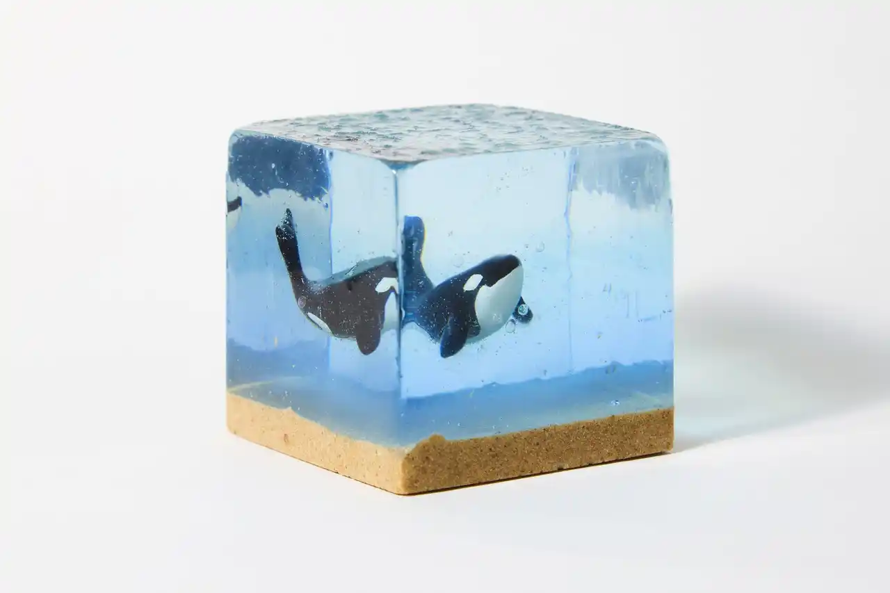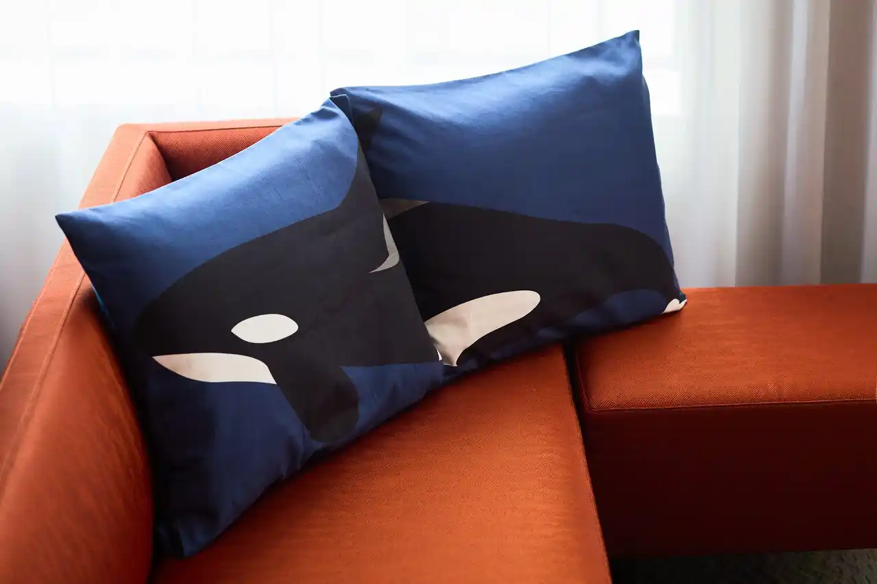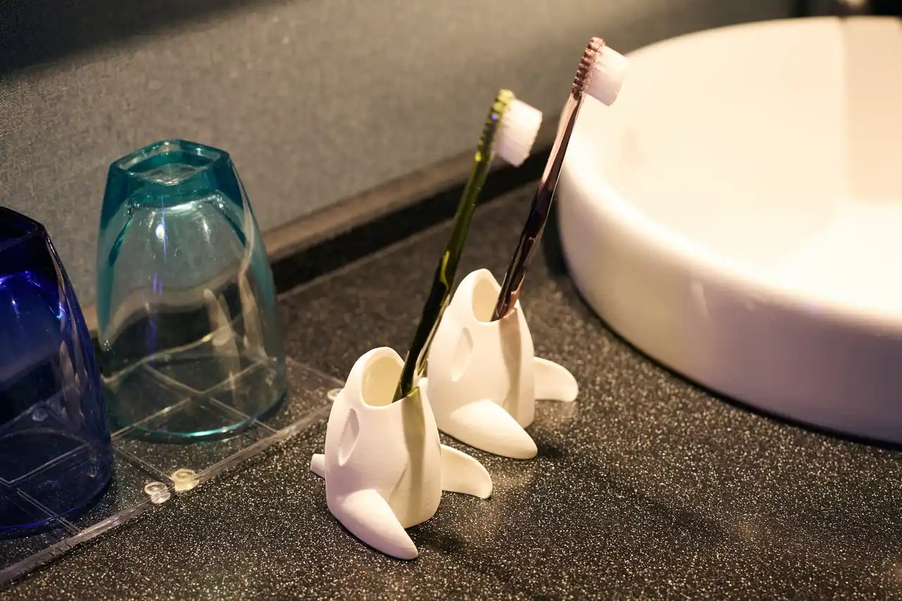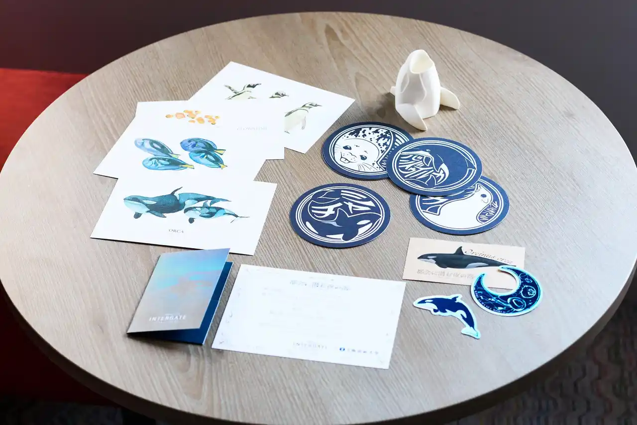 客室内には、学生たちが制作した多彩なアート作品が配置されています。神戸須磨シーワールドで展示している生きものをデザインしたシャンプーボトルや窓ステッカー、クッションに加え、海中を泳ぐシャチを再現した海中ジオラマ、ギヤマンクラゲやチンアナゴをデザインしたネオンなど、多彩なアイテムで夜の海の世界が表現されています。また、コースターやシャチをかたどった歯ブラシ立てなどお持ち帰りアイテムも充実しており、細部までこだわったアートルームとなっています。 |