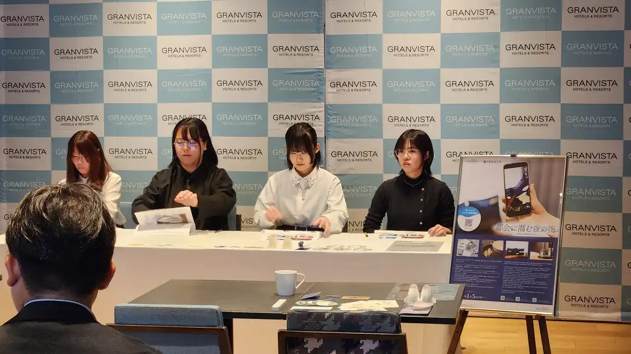 その後、プロジェクトに携わった学生4名よりアートルームの詳細に関するプレゼンテーションが実施されました。学生たちは、「神戸須磨シーワールドのもつ魅力を、ホテルインターゲート大阪 梅田の完成された空間に調和させ、どのように表現できるかを深く考えました。」と話し、学生ならではの視点が生かされたアートルームの魅力が伝えられました。 |