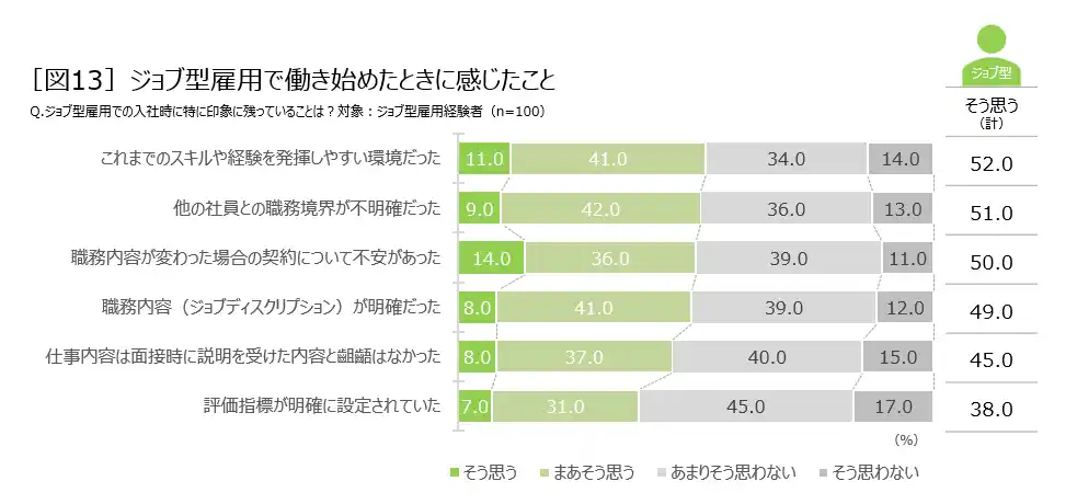ジョブ型雇用で働き始めたときに感じることは、「スキルを発揮しやすい環境」と良い印象の一方で「職務境界が不明確」「契約に対する不安」など不安が半々 |