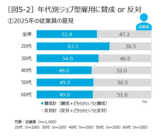 若い年代はジョブ型雇用に「賛成」が多いが、40代以上では「反対」の割合が半数超 |