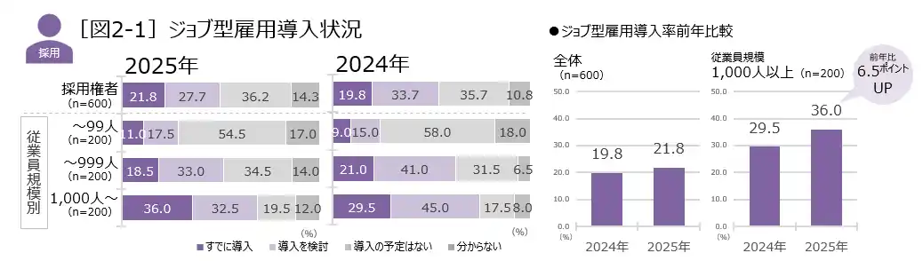 ジョブ型雇用の導入率は21.8%、1,000人以上企業では36.0%と前年比6.5ポイントUP 導入理由は「戦略的な人材採用」「従業員のスキルアップ」「より成果に即した評価をしたい」から |