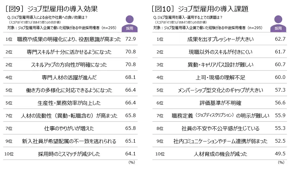 ジョブ型雇用の導入効果として、「役割意識の向上」「専門スキルの活用」「スキルアップの明確化」 一方、「成果を出すプレッシャーが大きい」「現職以外のスキルが付きにくい」という課題も明らかに |