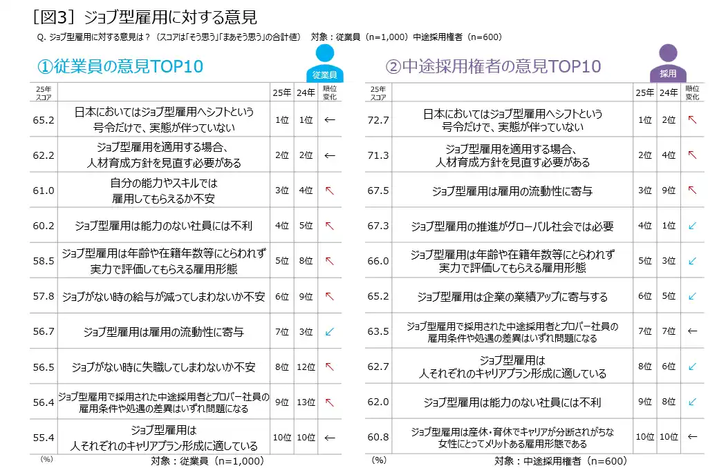 ジョブ型雇用は「号令だけで実態が伴っていない」と、従業員も中途採用権者も厳しい意見が最多 従業員は雇用への不安が大きく、中途採用権者はジョブ型ならではのメリットに注目 |