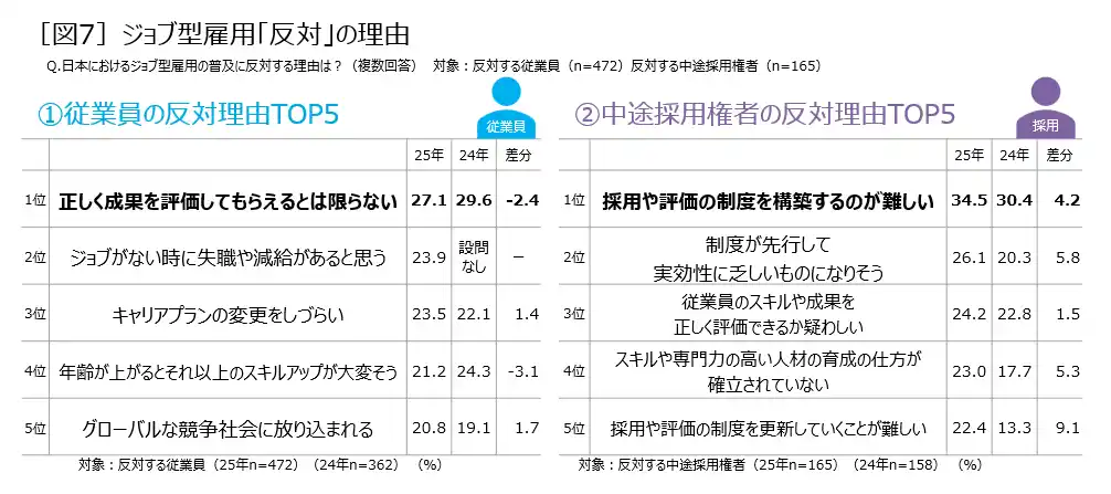 反対理由 従業員「正しく評価してもらえない」、中途採用権者「採用・評価制度の構築が難しい」 |
