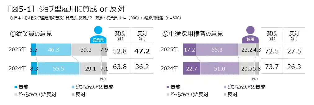 ジョブ型雇用の普及に対し、中途採用権者は約7割が「賛成」 従業員は賛成と反対が拮抗し、前回より「反対」が11ポイント増加 |