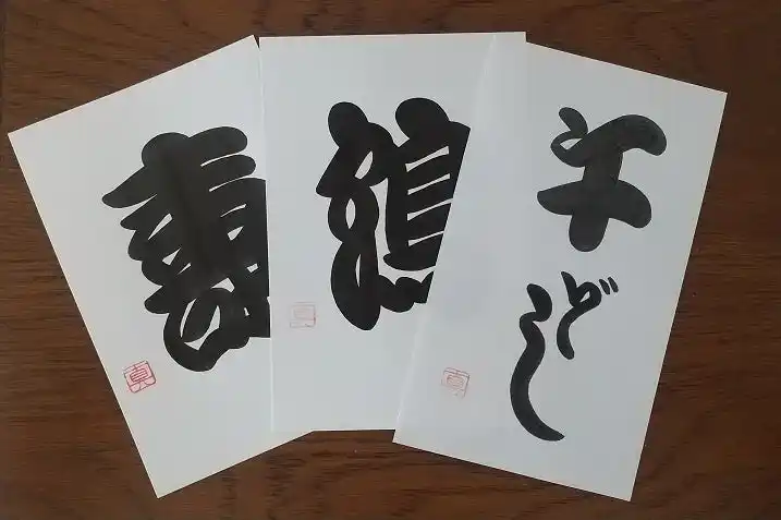 歌舞伎文字の概要を学んだ後、横棒・縦棒の基礎から丁寧に筆遣いを練習いたします。その後、お手本を見ながら文字の練習を行い、縁起ハガキをお作りいただけます。じっくり時間をかけて文字と向き合えるコースです。 |