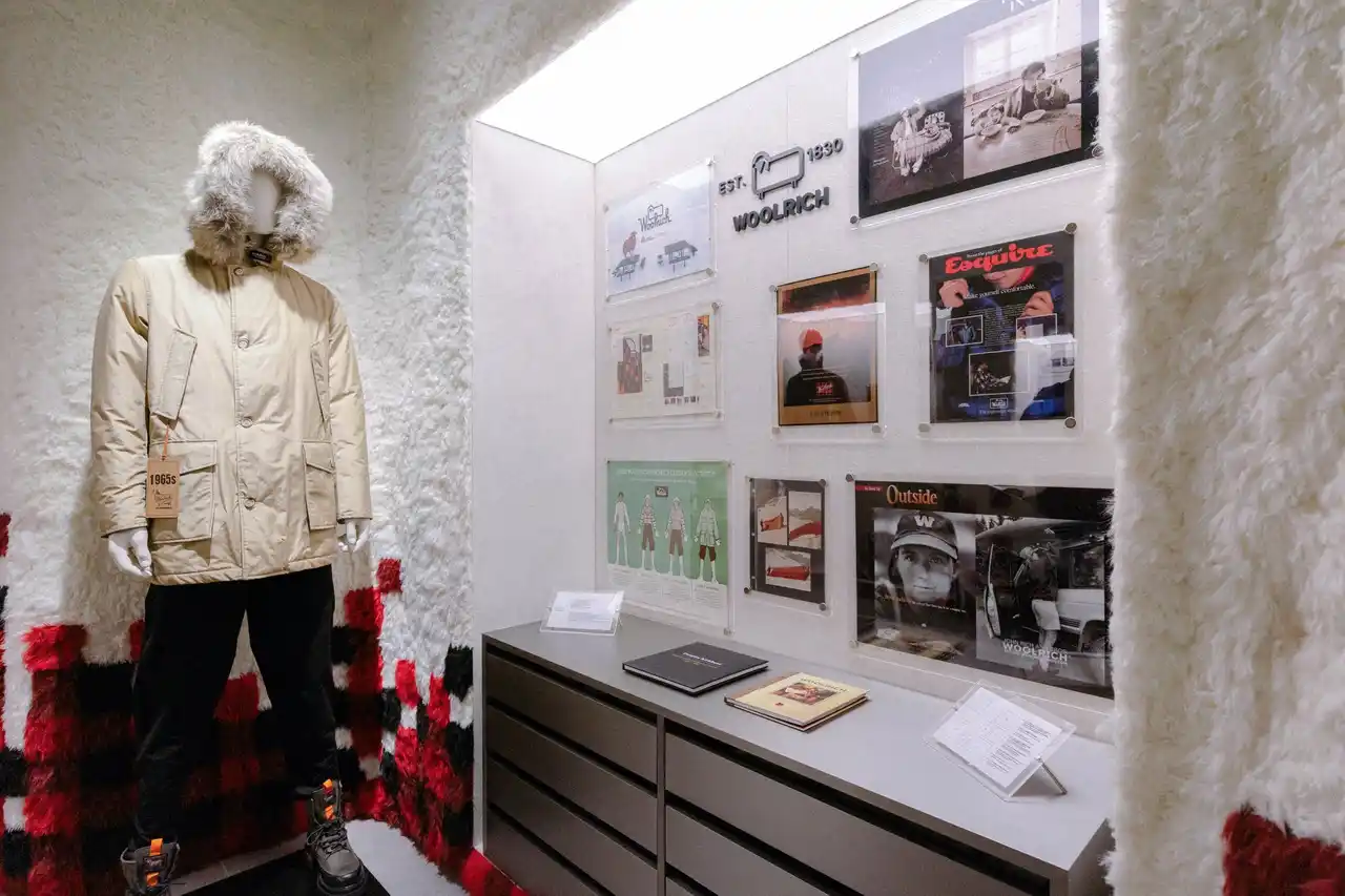 館内では、世界各地から集められた貴重なアーカイブピースを展示。ブランドを象徴する初代パーカーをはじめ、前世紀の貴重な写真や、大切に保存されてきた希少なデザイン画など、WOOLRICHの歴史とクラフツマンシップを間近で鑑賞することができます。 |
