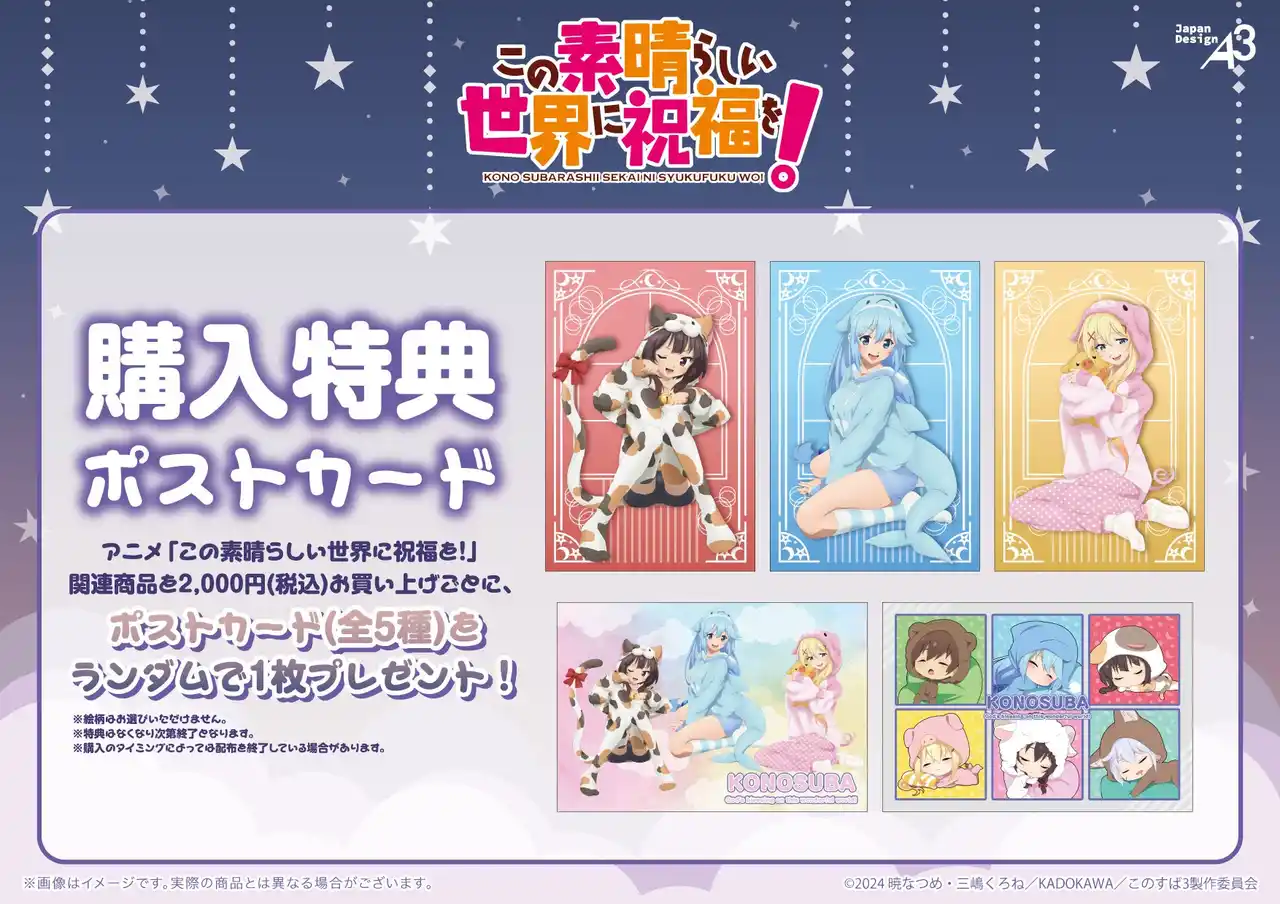 | アニメ「この素晴らしい世界に祝福を!」関連商品を2,000円(税込)お買い上げごとに、「ポストカード(全5種)」をランダムで1枚プレゼント。 | |||||||||||