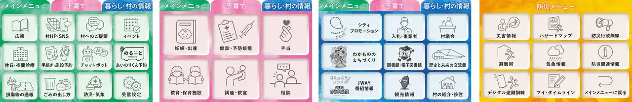 | LINEのトーク画面下部に固定表示されているリッチメニューを切り替えることができる「タブ機能」を利用して、ジャンル別にメニューを表示させることができるようになりました。「メインメニュー」「子育て」「暮らし・村の情報」に加え防災・気象の計4つのメニューを表示することができます。 | |||||||||||||||||||||||||||||||