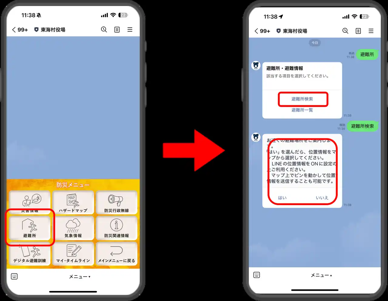 | 今回のリニューアルでは「避難所検索機能」を導入しています。画面の流れに沿って自身の位置情報を送信すると、近くの避難所施設一覧を検索することができます。普段から近くの避難所を確認しておき、いざとなった際にもLINE公式アカウントを利用して、安心して行動することができます。 | |||||||||||||||||||||||||||||||