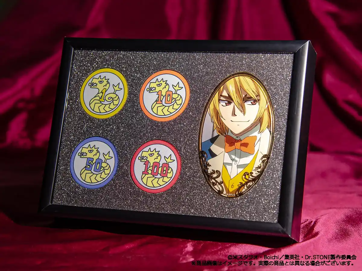 | 劇中に登場した図柄再現に加え、未登場図柄はアニメ製作委員会監修のもと描きおこし。他「ポーカーチップのラバーコースター」「龍水のポーカーチップ(4種記念セット)」もご案内。 |