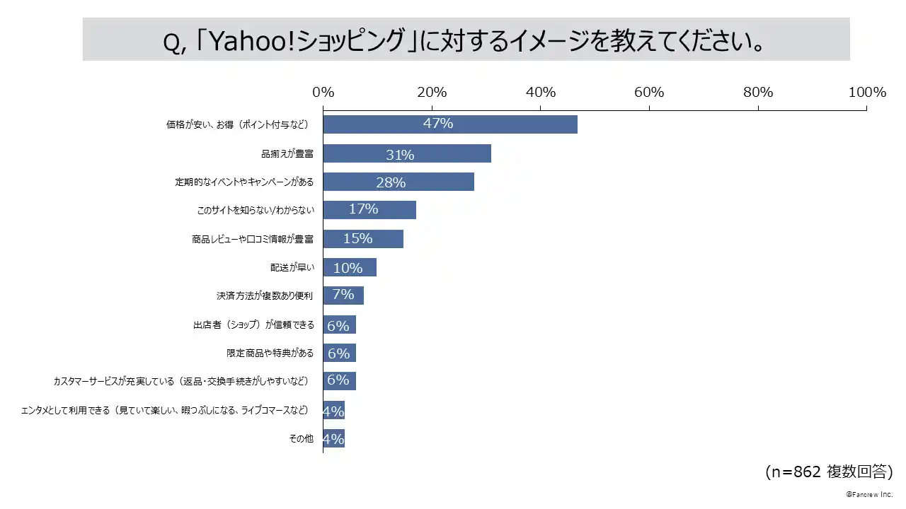 お客さまの声を最先端の分析でファン増加につなげる企業、株式会社ファンくる(本社:東京都千代田区、代表取締役社長:山口敬人)は、「ファンくる」会員を対象に、定期的に消費者の意識調査を実施しています。今回はECサイトについて、各ECサイトに対するイメージや、知っているECサイトなどを「ファンくる」会員862名(男性216名、女性646名)に調査を実施しました。 |