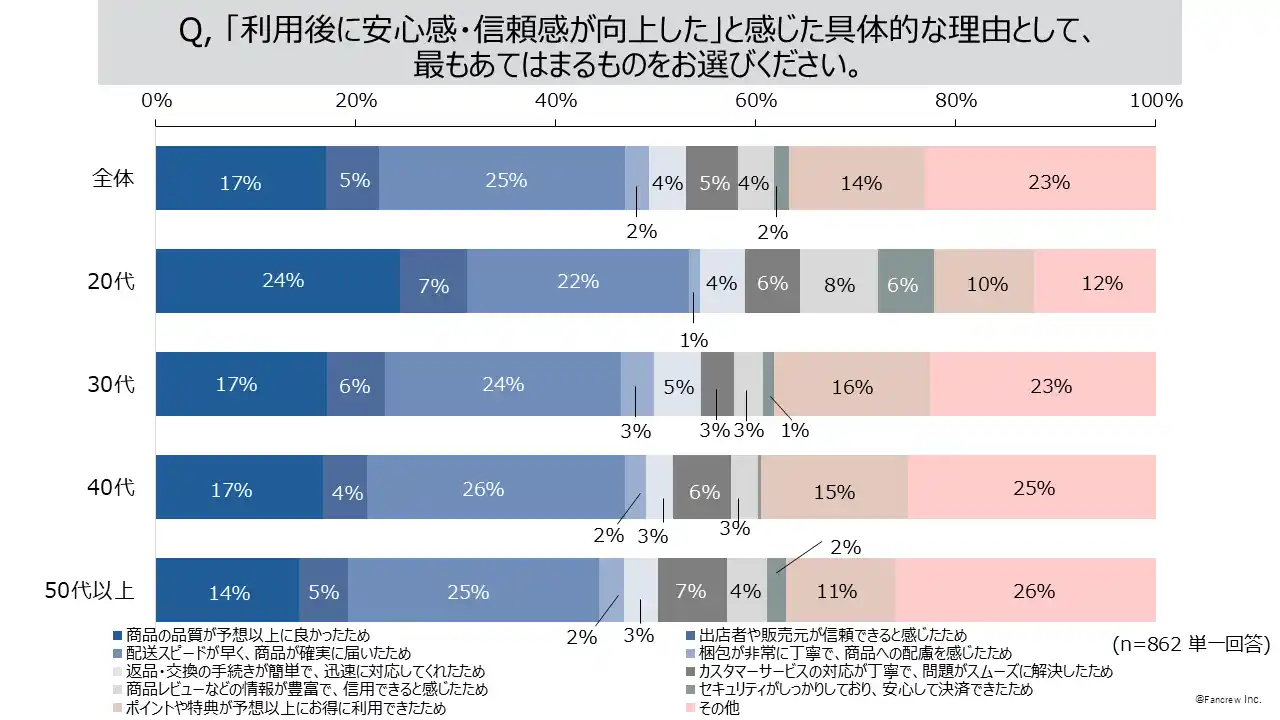 1.利用後に安心感・信頼感が向上したサイトは「Amazon」24%、理由は「配信スピードが早く、商品が確実に届いたため」 |