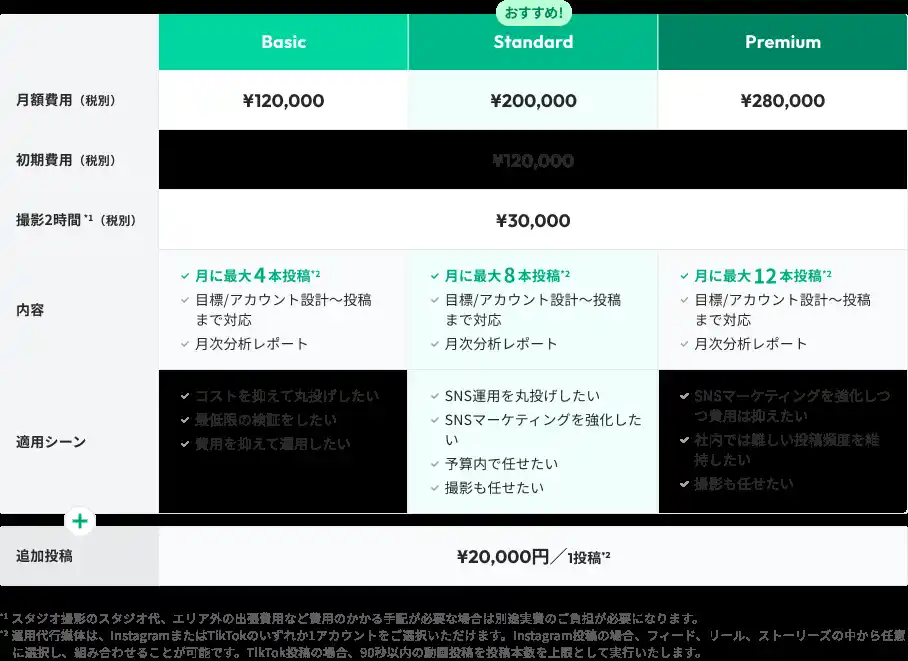 フルパッケージが月額12万円~と、業界トップクラスのリーズナブルな価格帯で提供。投稿本数や運用目的に合わせて選べる3つのプランを用意し、初めてSNS運用代行を利用する企業でも予算を組みやすい、明快な価格設計を実現しました。 |