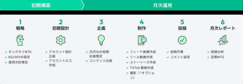 戦略設計からアカウント構築、コンテンツ制作、運用・分析まで、各領域のプロが専任チームを編成し、企業のSNS運用を一気通貫で代行。人的リソースの確保や内製化のコストを削減し、企業は本業へ集中することができます。 |