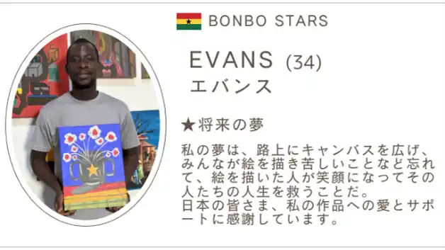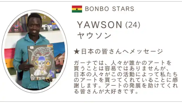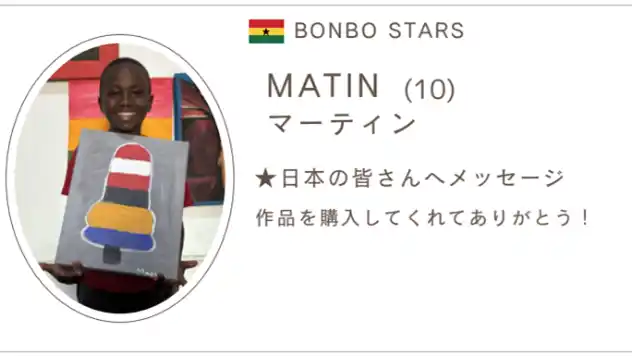 BONBO STARSとは、美術家・長坂真護氏のアートプロジェクトから誕生した、ガーナのスラム街・アグボグブロシー*から生まれたアーティスト集団です。彼らの作品は日本やアメリカ、ヨーロッパなど世界各国でこれまでに200点以上販売され、売上の10%が作家本人に還元されます。その収益は、アーティスト本人が自分自身の未来を切り拓くために、学費に充てたり家を建てたりすることなどに使われています。 |