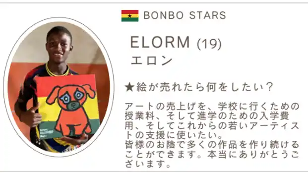 「BONBO STARSエポスカード」はこの取り組みに共感して生まれたもので、BONBO STARSに所属する4名の作家が描いたアート作品を券面に採用しました。また、当カードは新規のご入会1件につき1,000円をエポスカードからMAGO CREATION株式会社へお渡しすることに加え、カードのご利用金額に応じて付与されるポイントの一部が、BONBO STARSの活動継続に役立てられる仕組みを導入しています。これらの支援は、MAGO CREATION株式会社を通じ、アグボグブロシーのアーティストたちの未来を切り拓き、その才能を世界に届けるために使われます。 |