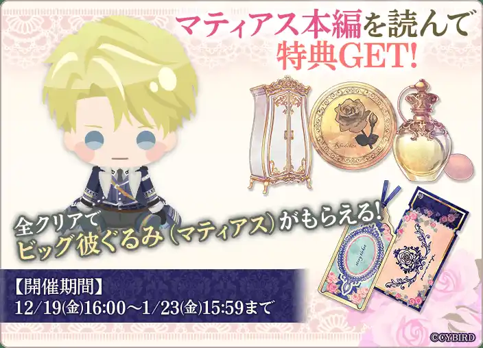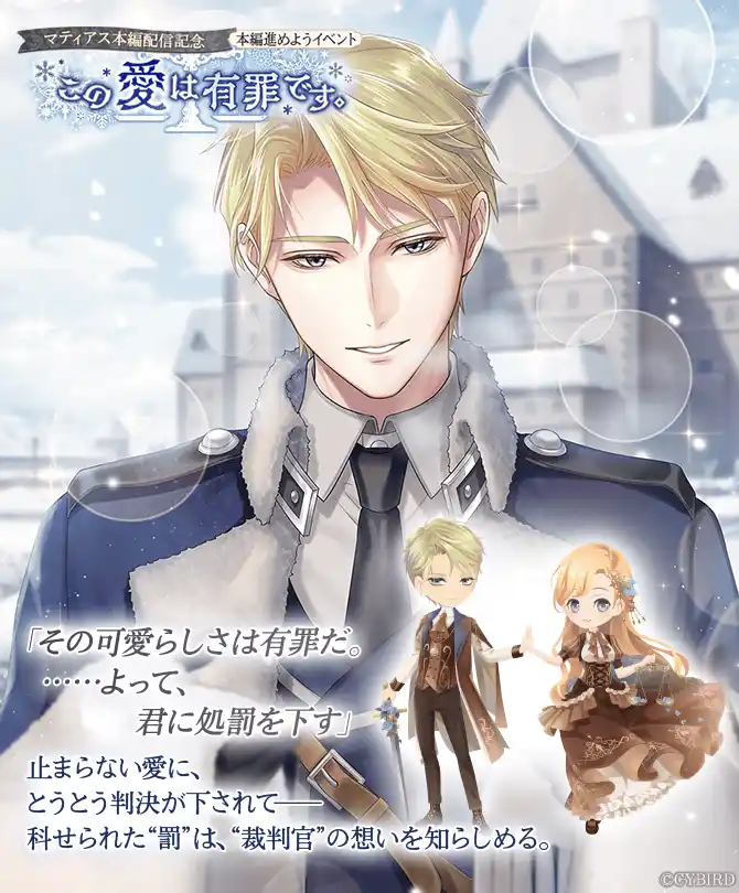 「マティアス=オースブリンク」本編配信を記念して、アプリ内では本編進めようイベント「マティアス本編配信記念 この愛は有罪です。」を、開催しています。 |