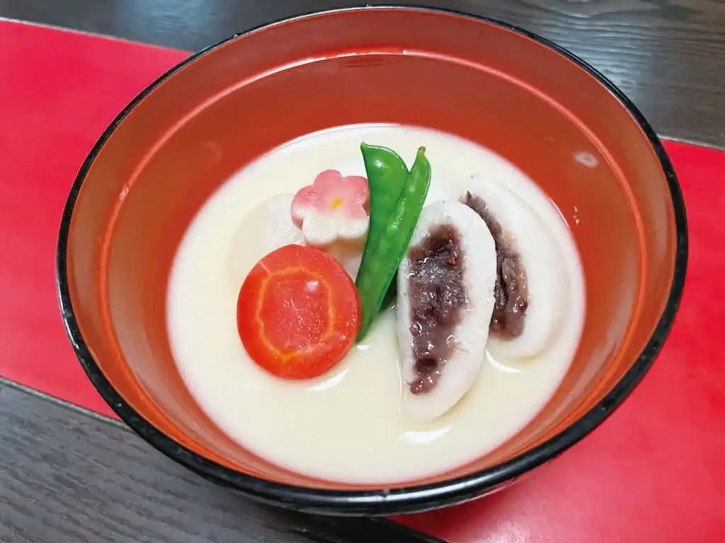 白味噌に餡餅が特徴の雑煮。輪切りの根菜に家族円満の願いを込めて。 |